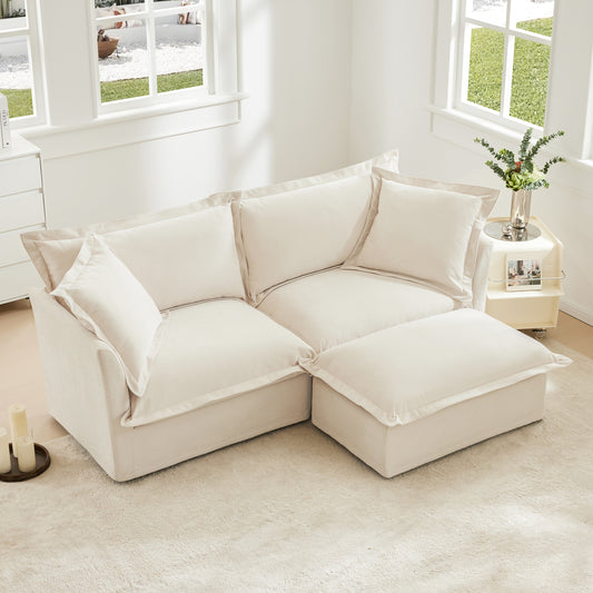 Fluffy 2-Seat Chenille Modular Sofa – Cream with Ottoman, Washable