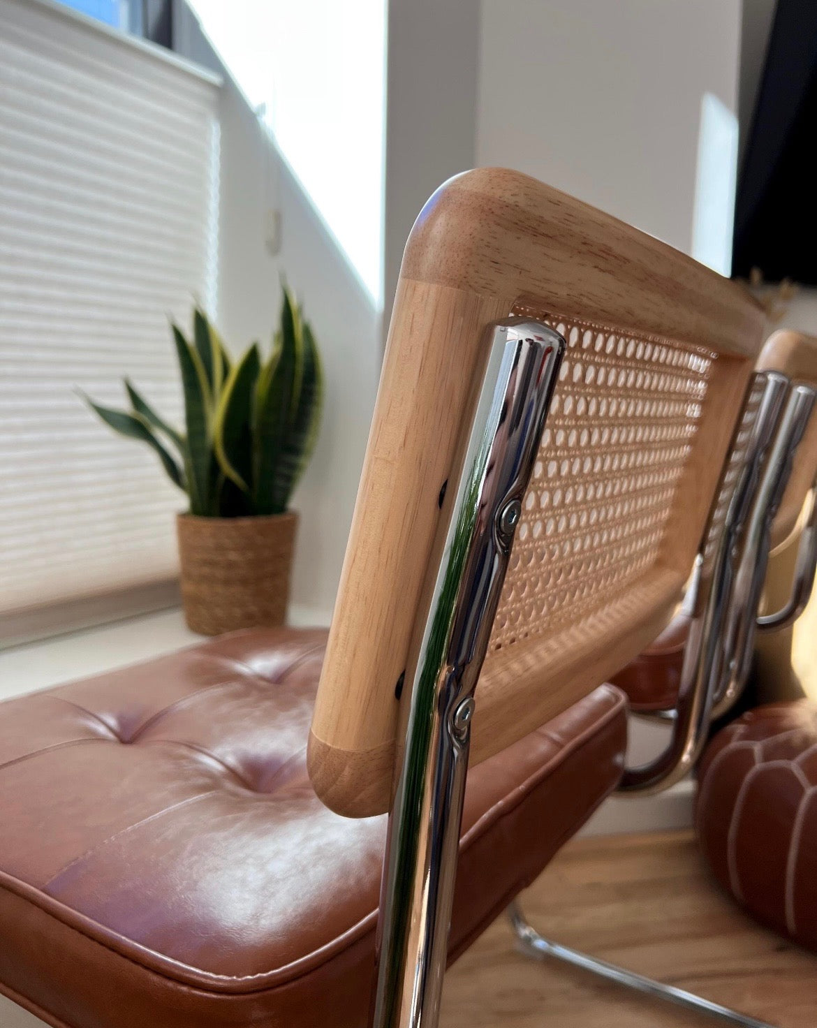 Elevate your kitchen or island seating with these Rattan Counter Stools. Featuring cane chairs at counter height, these stools come with stylish chrome legs and luxurious brown vegan leather upholstery. The combination of comfort and modern design makes these stools a perfect addition to your kitchen space.