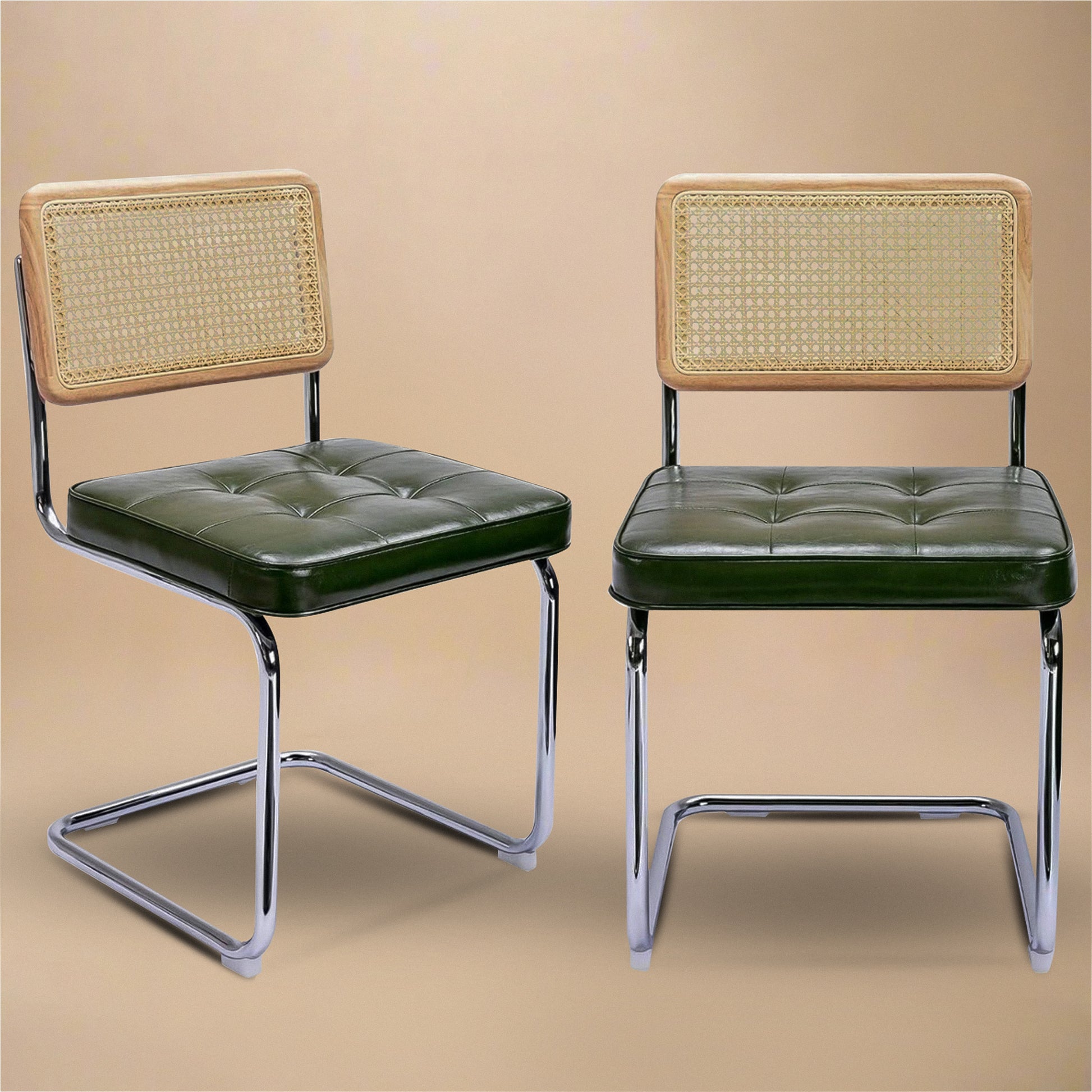 Elevate your dining space with these stylish Rattan Dining Chairs Featuring sleek, armless mesh cane backs and luxurious green vegan leather seating, these chairs combine timeless design with modern comfort. The sturdy metal chrome legs provide a sleek, contemporary finish that complements any dining room or living space.